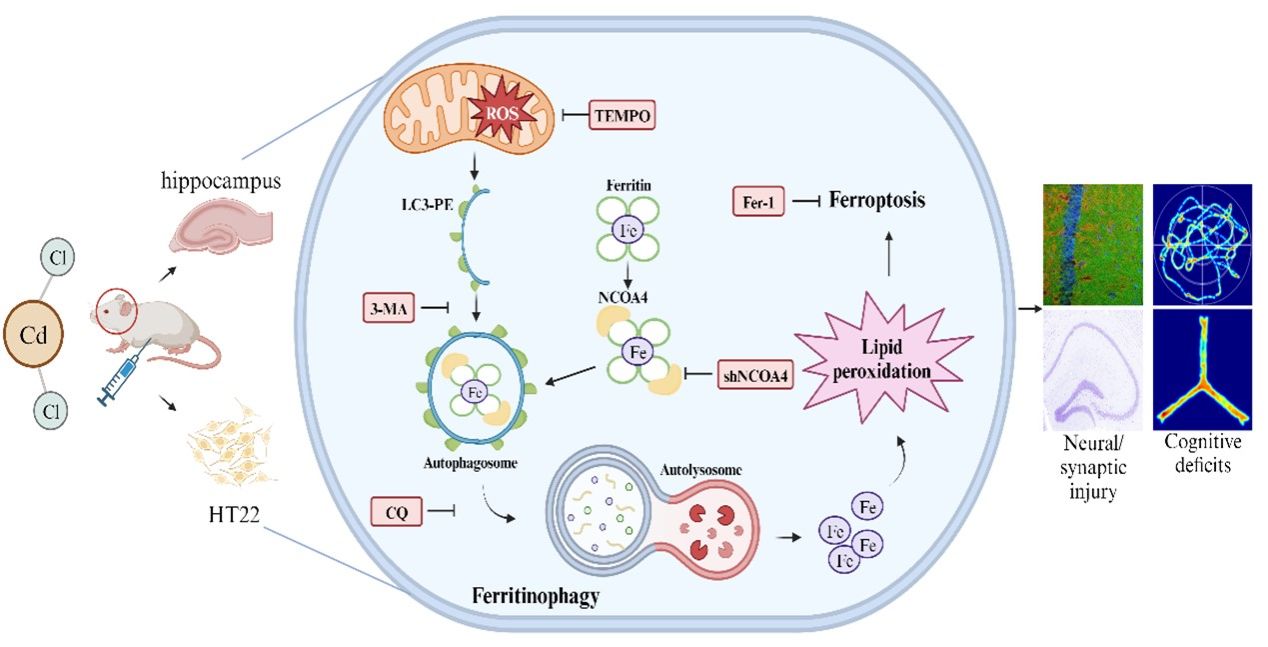 针对电子产品及镍镉电池污染引起的重金属镉 (Cd)暴露神经毒性,在前期Cd神经毒性研究的基础上,该团队首次报道铁自噬介导的铁死亡是Cd暴露引起神经元死亡的主要原因,明确了自噬-NCOX4依赖的铁自噬-铁死亡的机制在Cd神经毒性发病机制中的重要作用,为评价通过抑制NCOA4介导的铁自噬进而改善神经元铁死亡来保护Cd诱导的神经元退行性病变和认知损伤提供确切的理论与实验基础,并对今后Cd神经毒性的早期临床预防治疗提供新的策略。