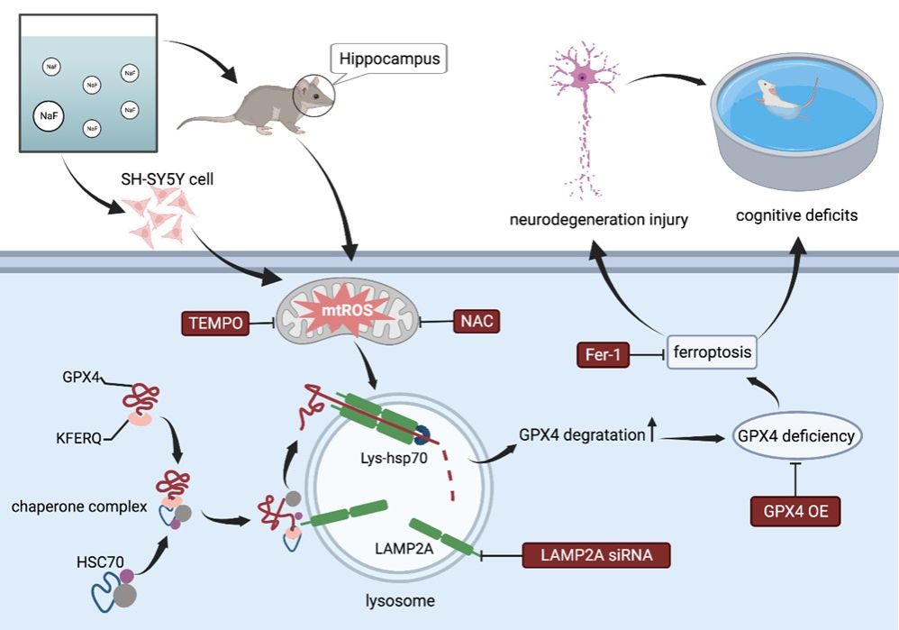 针对长期慢性低剂量氟暴露引起的神经毒性和行为认知异常,在前期氟神经毒性研究的基础上,王冬梅教授带领科研团队成员持续探索,首次揭示分子伴侣介导的GPX4自噬降解介导的铁死亡是氟暴露引起神经元死亡的主要原因,不仅明确了CMA-GPX4-铁死亡的机制在氟神经毒性发病机制中的重要作用,而且阐述了铁死亡抑制剂Fer-1、靶向GPX4或者抑制CMA活性均能够通过抑制铁死亡有效的拮抗氟诱导的神经毒性和认知损伤。本项目的研究在揭示氟神经毒性和认知损伤发病机制的同时,为氟化脑的治疗提供关键性的治疗靶点。