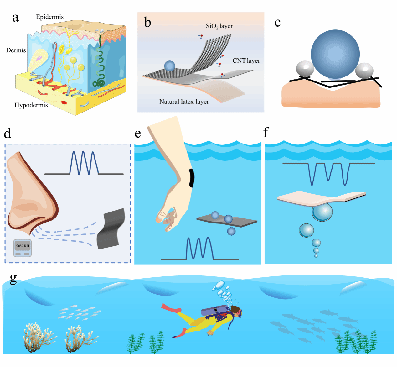 该研究旨在开发能够在水下监测人体多种生理信号的多功能柔性传感器,对保障潜水员在水下活动的安全具有重要的现实意义。该工作通过模拟人体皮肤结构,采用自组装的方法在弹性体表面构建出由碳纳米管和有机二氧化硅形成的感知层和超疏水保护层,从而制备多功能传柔性感器。该传感器可以通过检测湿度的变化来监测人体呼吸,超疏水表面使其在水下能够稳定、灵敏地检测应变。此外,传感器还能够对其浸入和浮出水面的过程以及在水下对气泡产生响应。基于上述特性,分别实现了通过潜水面罩内的传感器监测潜水员在水下的呼吸,连接在腕关节上的传感器监测水下运动,潜水面罩外的传感器监测呼吸排出的气泡。该传感器在水下对人体生理信号的多重感知可有效监测潜水员在水下的运动状态,为其潜水事业筑牢安全屏障。