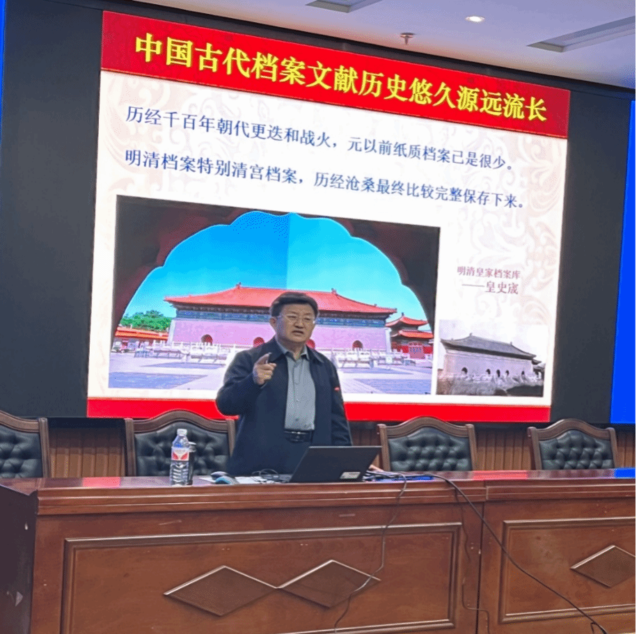 李国荣研究员的讲座聚焦清宫档案与清史研究,围绕四个部分展开:清宫档案与国运沧桑、清宫档案与国学大师、清宫档案的百年刊布、清宫档案的开发研究。李国荣研究员首先从甲骨文、金文、石鼓文、简牍文献、丝织缣帛、纸质文献等几个方面,为师生们详细介绍了中国古代档案的演进发展,重点阐述了清宫档案的独特价值。