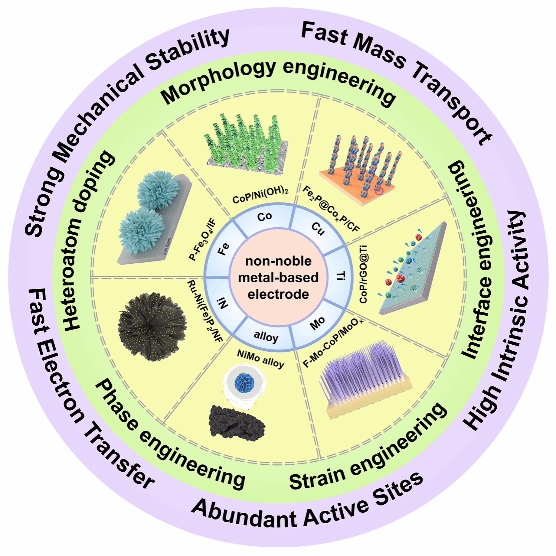 制氢为氢能产业链首当其冲的重要一环,直接决定着整个氢能产业的发展水平。研制具有高效能、低成本的双功能电催化材料是降低反应过电位、提升能量转化效率的关键。基于非贵金属基自支撑电极(镍、铁、铜、钴、钛、钼及其合金体系)的新型催化材料研究已取得系列突破性成果。但现存催化材料体系普遍存在工况适应性不足的问题:多数材料仅在低电流密度工况(通常低于200 mA cm−2)和短周期(通常不足100小时)运行中保持催化活性,这与工业级电解水设备对高稳定性、高电流密度耐受性的技术要求存在显著差距。本文系统地梳理了近年来高电流密度工况下非贵金属基自支撑电极的研究进展,通过结构分类与机理分析构建了系统的研究框架,并对制氢行业的未来发展提出建议和展望。